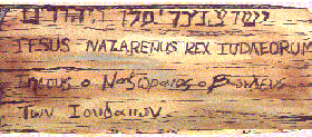 The procedure of crucifixion may be summarized as follows. The patibulum was put on the ground and the victim laid upon it. Nails, about 7 inches long and with a diameter of 1 cm ( roughly 3/8 of an inch) were driven in the wrists . The points would go into the vicinity of the median nerve, causing shocks of pain to radiate through the arms. It was possible to place the nails between the bones so that no fractures (or broken bones) occurred. Studies have shown that nails were probably driven through the small bones of the wrist, since nails in the palms of the hand would not support the weight of a body. In ancient terminology, the wrist was considered to be part of the hand. (Davis) Standing at the crucifixion sites would be upright posts, called stipes, standing about 7 feet high.(Edwards) In the center of the stipes was a crude seat, called a sedile or sedulum, which served a support for the victim. The patibulum was then lifted on to the stipes. The feet were then nailed to the stipes. To allow for this, the knees had to be bent and rotated laterally, being left in a very uncomfortable position. The titulus was hung above the victim's head.