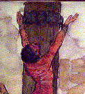 "...it appears likely that the mechanism of death in crucifixion was suffocation. The chain of events which ultimately led to suffocation are as follows: With the weight of the body being supported by the sedulum, the arms were pulled upward. This caused the intercostal and pectoral muscles to be stretched. Furthermore, movement of these muscles was opposed by the weight of the body. With the muscles of respiration thus stretched, the respiratory bellows became relatively fixed. As dyspnea developed and pain in the wrists and arms increased, the victim was forced to raise the body off the sedulum, thereby transferring the weight of the body to the feet. Respirations became easier, but with the weight of the body being exerted on the feet, pain in the feet and legs mounted. When the pain became unbearable, the victim again slumped down on the sedulum with the weight of the body pulling on the wrists and again stretching the intercostal muscles. Thus, the victim alternated between lifting his body off the sedulum in order to breathe and slumping down on the sedulum to relieve pain in the feet. Eventually , he became exhausted or lapsed into unconsciousness so that he could no longer lift his body off the sedulum. In this position, with the respiratory muscles essentially paralyzed, the victim suffocated and died. (DePasquale and Burch)